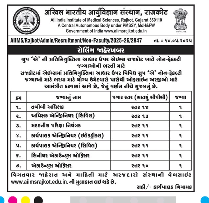 એઈમ્સ રાજકોટ દ્વારા ગ્રુપ ‘એ’ નોન-ફેકલ્ટી માં તબીબી અધિક્ષક, અધિક્ષક એન્જિનિયર, કાર્યપાલક એન્જિનિયર, વગેરે ના પદો માટે ભરતી ની પ્રક્રિયા હાલમાં ચાલી રહી છે. આ પદો સાથે સંકળાયેલી વધુ જાણકારી મેળવવા માટે સંસ્થા દ્વારા પ્રસિદ્ધ કરાયેલી સત્તાવાર જાહેરાતને ધ્યાનપૂર્વક વાંચવાની ભલામણ કરવામાં આવે છે.