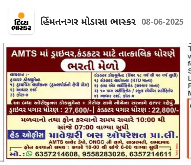 અમદાવાદ મ્યુનિસિપલ ટ્રાન્સપોર્ટ સર્વિસ દ્વારા ડ્રાઈવર, કંડક્ટર ના પદો માટે ભરતી ની પ્રક્રિયા હાલમાં ચાલી રહી છે. આ પદો સાથે સંકળાયેલી વધુ જાણકારી મેળવવા માટે સંસ્થા દ્વારા પ્રસિદ્ધ કરાયેલી સત્તાવાર જાહેરાતને ધ્યાનપૂર્વક વાંચવાની ભલામણ કરવામાં આવે છે.