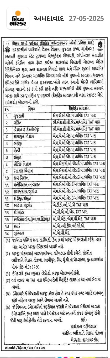 ઉમેદવાર મિત્રો, એકલવ્ય મોડેલ રેસિડેન્સિયલ સ્કૂલ દ્વારા કુલ જગ્યાઓ જણાવેલ નથી. જગ્યાઓ સંબંધિત વધુ માહિતી મેળવવા માટે જાહેરાત ધ્યાનથી વાંચવાની ભલામણ કરવામાં આવે છે.