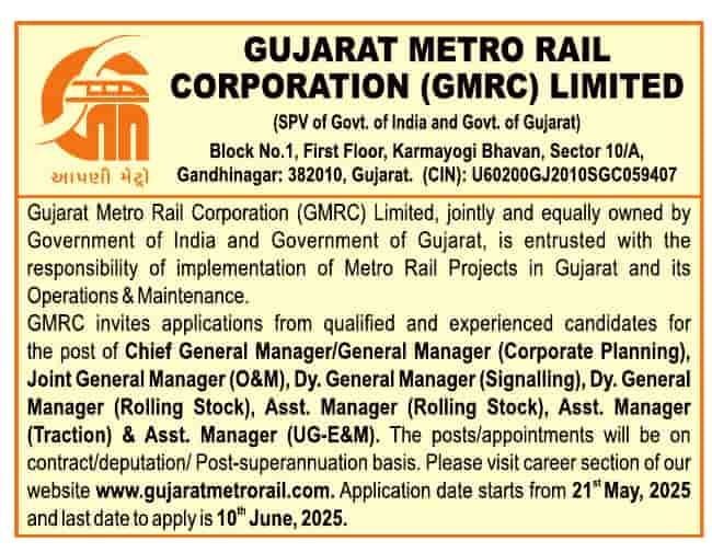 ગુજરાત મેટ્રો રેલ કોર્પોરેશન ભરતી ની જાહેરાત 21 મેં 2025ના રોજ બહાર પાડવામાં આવી છે. આ ભરતી માટે અરજી કરવાની અંતિમ તારીખ 10 જૂન 2025 નિશ્ચિત કરવામાં આવી છે. જો તમે આ શાનદાર તકનો લાભ લઈને ભરતી પ્રક્રિયામાં સામેલ થવા માગતા હો, તો અમારી નમ્ર સલાહ છે કે તમે નિર્ધારિત સમયમર્યાદા પહેલાં તમારી અરજી તૈયાર કરીને સબમિટ કરી દો, કેમ કે એકવાર છેલ્લી તારીખ વીતી ગયા પછી કોઈપણ પ્રકારની અરજીઓને માન્યતા આપવામાં આવશે નહીં.