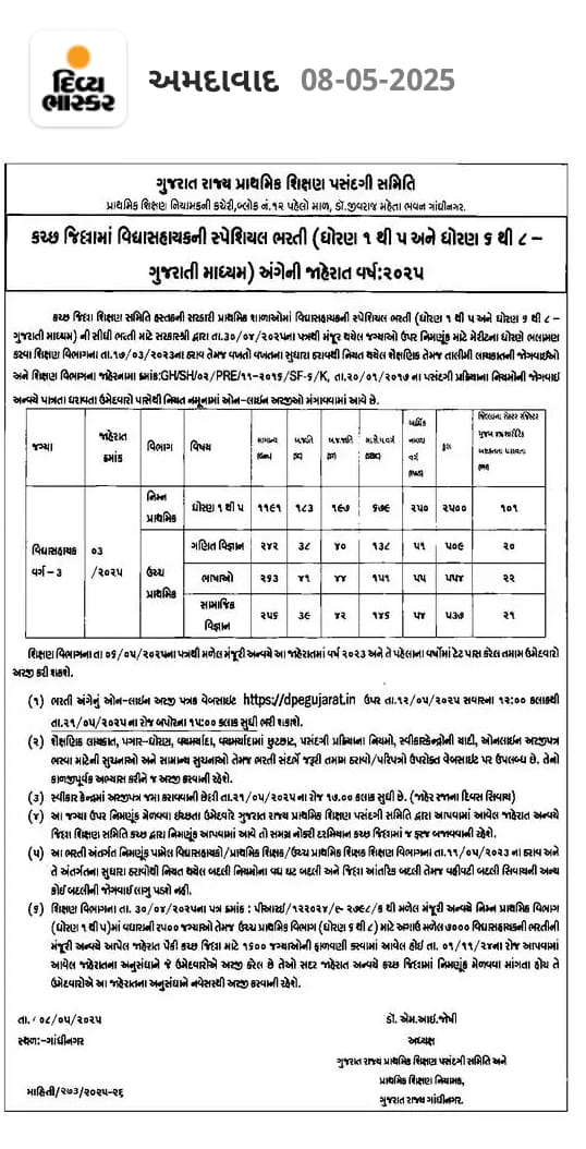 ગુજરાત રાજ્ય પ્રાથમિક શિક્ષણ પસંદગી સમિતિ ભરતી ની જાહેરાત 03 મેં 2025ના રોજ બહાર પાડવામાં આવી છે. આ ભરતી માટે અરજી કરવાની અંતિમ તારીખ 21 મેં 2025 નિશ્ચિત કરવામાં આવી છે. જો તમે આ શાનદાર તકનો લાભ લઈને ભરતી પ્રક્રિયામાં સામેલ થવા માગતા હો, તો અમારી નમ્ર સલાહ છે કે તમે નિર્ધારિત સમયમર્યાદા પહેલાં તમારી અરજી તૈયાર કરીને સબમિટ કરી દો, કેમ કે એકવાર છેલ્લી તારીખ વીતી ગયા પછી કોઈપણ પ્રકારની અરજીઓને માન્યતા આપવામાં આવશે નહીં.