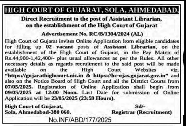 | સંસ્થા/વિભાગનું નામ | ગુજરાત હાઈકોર્ટ દ્વારા અસિસ્ટન્ટ લાઇબ્રેરિયન |