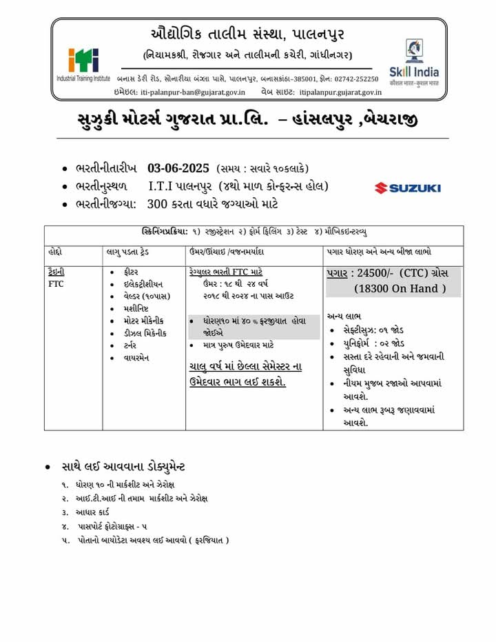 સુઝુકી મોટર્સ ગુજરાત પ્રા. લિ દ્વારા ફીટર, ઇલેક્ટ્રિશિયન, વેલ્ડર, મશીનિસ્ટ, મોટર મિકેનિક, ડીઝલ મિકેનિક, ટર્નર, વાયરમેન ના પદો માટે ભરતી ની પ્રક્રિયા હાલમાં ચાલી રહી છે. આ પદો સાથે સંકળાયેલી વધુ જાણકારી મેળવવા માટે સંસ્થા દ્વારા પ્રસિદ્ધ કરાયેલી સત્તાવાર જાહેરાતને ધ્યાનપૂર્વક વાંચવાની ભલામણ કરવામાં આવે છે.