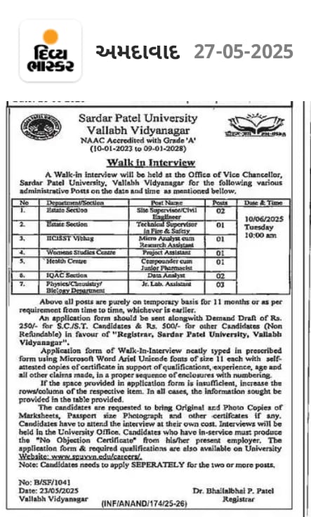 સરદાર પટેલ યુનિવર્સિટી દ્વારા સાઇટ સુપરવાઇઝર/સિવિલ એન્જિનિયર, ટેકનિકલ સુપરવાઇઝર (ફાયર એન્ડ સેફ્ટી), એનાલિસ્ટ કમ રિસર્ચ આસિસ્ટન્ટ, પ્રોજેક્ટ આસિસ્ટન્ટ, કમ્પાઉન્ડર કમ જુનિયર ફાર્માસિસ્ટ, ડેટા એનાલિસ્ટ, જુનિયર લેબ આસિસ્ટન્ટ ના પદો માટે ભરતી ની પ્રક્રિયા હાલમાં ચાલી રહી છે. આ પદો સાથે સંકળાયેલી વધુ જાણકારી મેળવવા માટે સંસ્થા દ્વારા પ્રસિદ્ધ કરાયેલી સત્તાવાર જાહેરાતને ધ્યાનપૂર્વક વાંચવાની ભલામણ કરવામાં આવે છે.