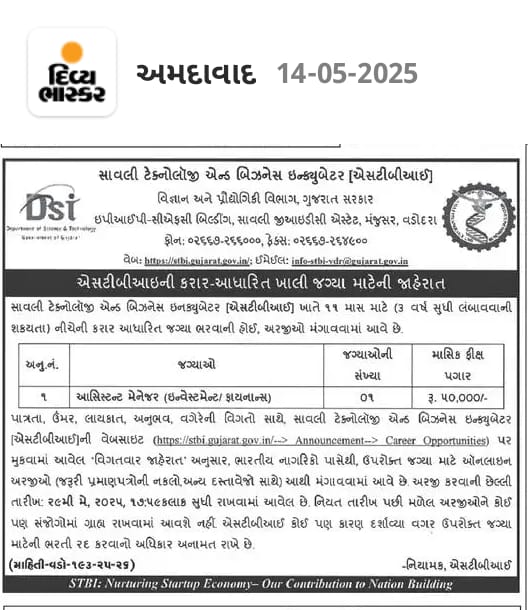 STBI Recruitment: સાવલી ટેક્નોલૉજી એન્ડ બિઝનેસ ઇન્ક્યુબેટર દ્વારા આસિસ્ટન્ટ મેનેજર ના પદો પર ભરતી જાહેર ,પગાર ₹50,000/- થી શરુ