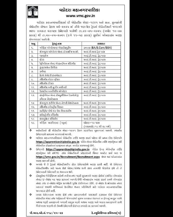 વડોદરા મહાનગરપાલિકા દ્વારા ઓફિસ ઓપરેશન્સ એકઝીકયુટીવ,કોમ્પ્યુટર ઓપરેટર એન્ડ પ્રોગ્રામીંગ આસિસ્ટન્ટ,વાયરમેન,રેફ્રિજરેશન એન્ડ એરકન્ડિશન મિકેનિક,ડ્રાફ્ટસમેન સિવિલ,સર્વેયર,હેલ્થ સેનિટરી ઈન્સ્પેક્ટર,મિકેનિક મોટર વ્હીકલ,મિકેનિક ડીઝલ,મિકેનિક અર્થ મુવિંગ મશીનરી,ડેસ્કટોપ પબ્લિશિંગ ઓપરેટર,ઈન્ફોર્મેશન એન્ડ કોમ્યુનિકેશન ટેકનોલોજી સિસ્ટમ મેન્ટેનન્સ,કોમ્પ્યુટર હાર્ડવેર એન્ડ નેટવર્ક મેન્ટેનન્સ,મિકેનિક ઈલેક્ટ્રિક વ્હીકલ,સર્ટિફિકેટ કોર્સ ઈન વેબ ડિઝાઈનિંગ,ઈલેક્ટ્રોનિક મિકેનિક,ઈન્સ્ટ્રુમેન્ટ મિકેનિક,ઓફિસ આસિસ્ટન્ટ (પ્યૂન) ના પદો માટે ભરતી ની પ્રક્રિયા હાલમાં ચાલી રહી છે. આ પદો સાથે સંકળાયેલી વધુ જાણકારી મેળવવા માટે સંસ્થા દ્વારા પ્રસિદ્ધ કરાયેલી સત્તાવાર જાહેરાતને ધ્યાનપૂર્વક વાંચવાની ભલામણ કરવામાં આવે છે.